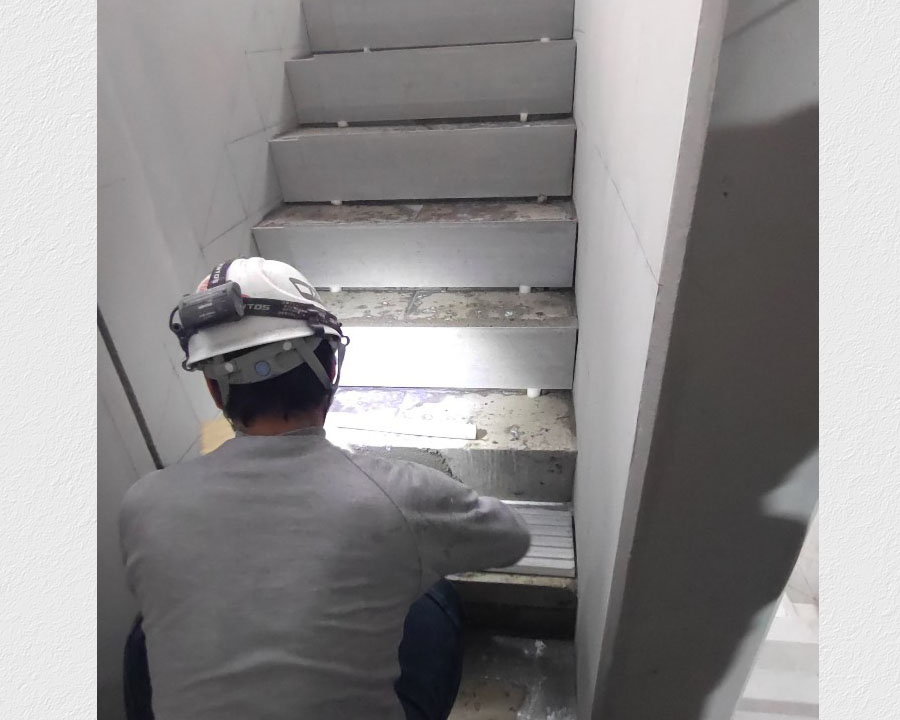 下地処理後にクリスタルインレイを塗布、ある程度乾いたらノロやモルタルをスポンジで除去し施工完了です。